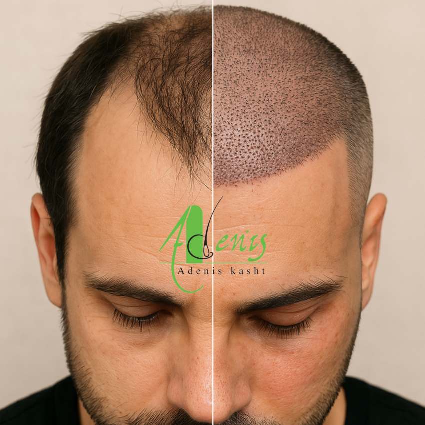 - ترکیب موی بدن با FUE: موهای ریش در نواحی جلوی سر و موهای بدن برای پر کردن وسط سر به کار میروند.